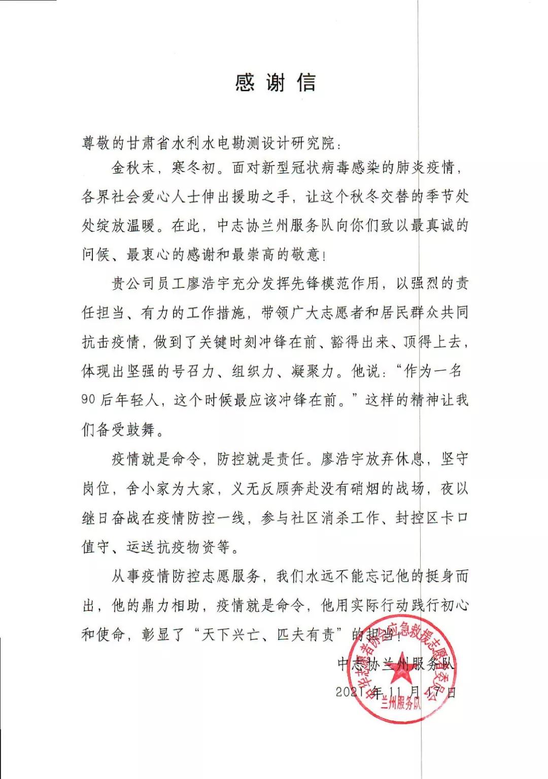 近日,水電設(shè)計(jì)院收到中志協(xié)蘭州服務(wù)隊(duì)和團(tuán)結(jié)新村街道天平街社區(qū)發(fā)來(lái)的感謝信。信中對(duì)水電設(shè)計(jì)院規(guī)劃院?jiǎn)T工廖浩宇在此次疫情發(fā)生后,主動(dòng)請(qǐng)纓參加疫情防控服務(wù)工作,甘當(dāng)疫情防控最美逆行者,持續(xù)堅(jiān)持26天志愿者服務(wù)的先進(jìn)事跡表示感謝。
