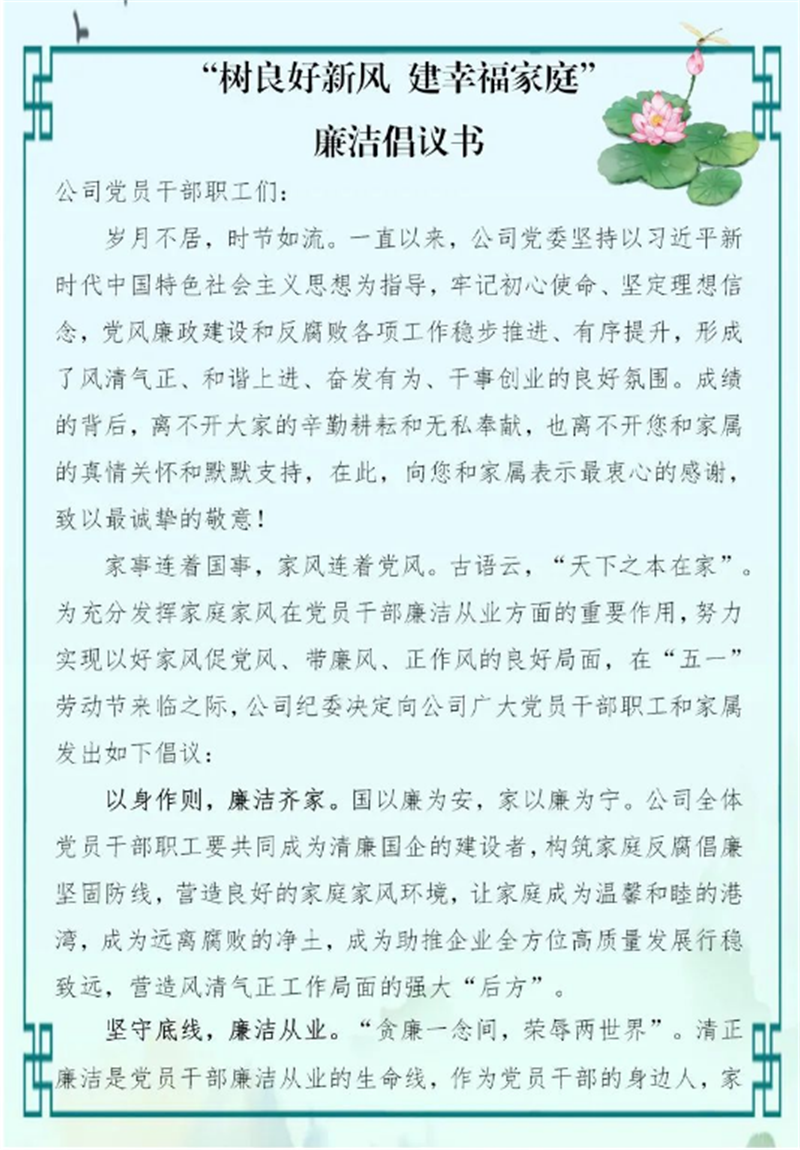集團(tuán)公司把家風(fēng)建設(shè)作為廉潔文化建設(shè)的重要一環(huán),結(jié)合文明家庭創(chuàng)建,開(kāi)展家庭助廉教育,以家風(fēng)促作風(fēng),以親情促廉情。