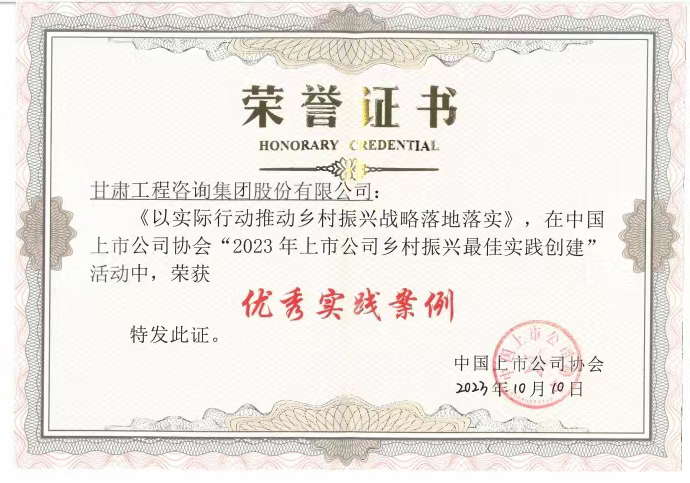 近日,在中國上市公司協(xié)會主辦的上市公司鄉(xiāng)村振興經(jīng)驗交流會暨最佳實踐案例發(fā)布會上,由甘肅工程咨詢集團申報的鄉(xiāng)村振興實施案例榮獲“優(yōu)秀實踐案例”。