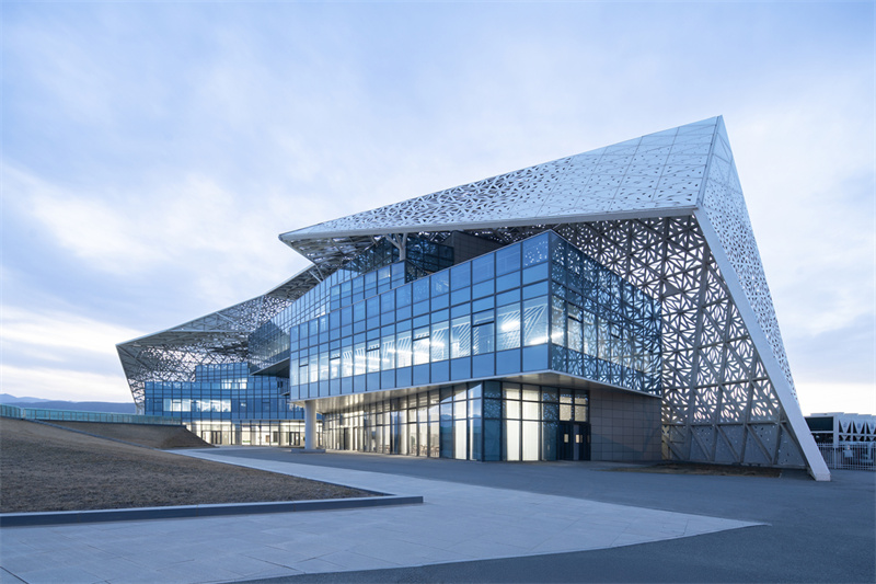 在設(shè)計過程中,設(shè)計團隊深度融合“生態(tài)”與“創(chuàng)新”理念,將全生命周期綠色低碳理念貫穿始終,在場地規(guī)劃、空間營造、技術(shù)整合與材料應用等方面實現(xiàn)了系統(tǒng)性創(chuàng)新突破。建筑布局緊密貼合榆中當?shù)貧夂蚺c地形特征,充分運用被動式設(shè)計策略,最大程度利用自然采光與通風,有效降低建筑運行能耗。技術(shù)應用上,項目集成高效地源熱泵系統(tǒng)、建筑光伏一體化(BIPV)技術(shù)、智能能源管理與雨水回收利用系統(tǒng)等,構(gòu)建起高效循環(huán)的資源利用體系。材料選擇方面,大量采用本地化、可再生及低碳建材,融入具有甘肅地域文化特色的生態(tài)景觀設(shè)計,使科創(chuàng)中心成為與周邊自然環(huán)境和諧共生、彰顯隴原風貌的綠色建筑典范。
