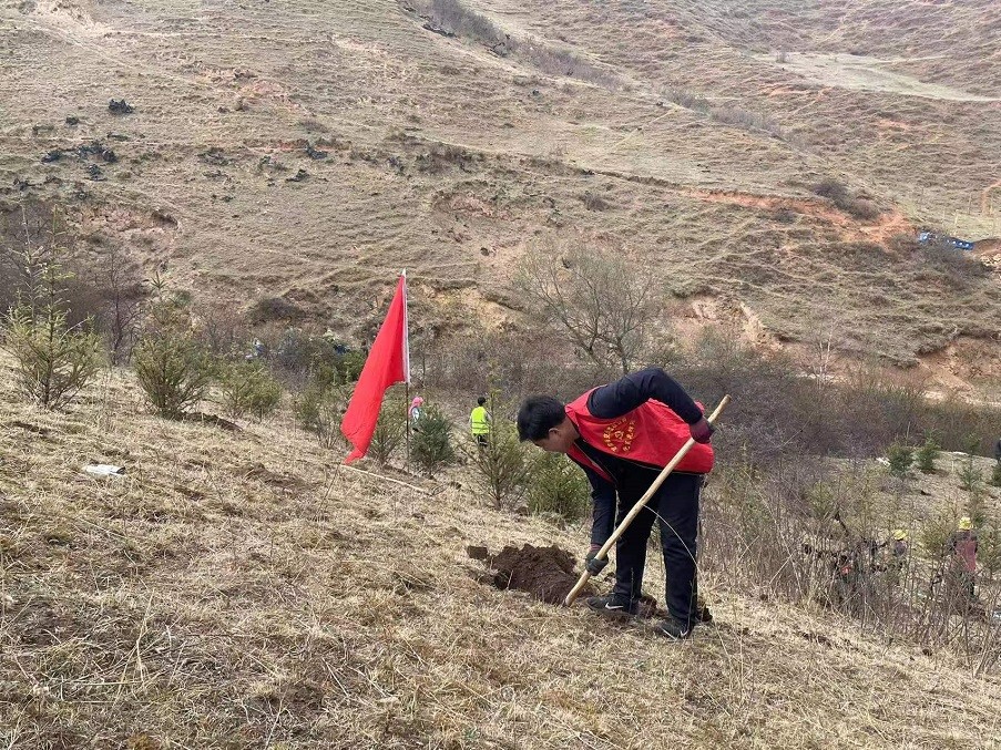 植樹(shù)現(xiàn)場(chǎng),黨旗招展,有的揮鍬鏟土,有的扶樹(shù)填坑,有的澆水灌根,大家分工合作,默契配合,干勁十足,認(rèn)真完成每一道工序。在大家的共同努力下,由交通監(jiān)理公司運(yùn)送的800余棵云杉樹(shù)苗迎風(fēng)挺立,為馬旦溝村再添一抹新綠。