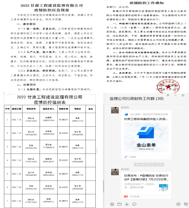 面對疫情“大考”,甘肅建筑設(shè)計院以高度的責(zé)任感守護疫情防控的“省院”防線,在阻擊疫情方面,堅持聞令而動、令行禁止,做好自身防護的同時,選派干部響應(yīng)號召下沉街道,派出志愿者助力轄區(qū)防控,把省市的各項防控舉措落實落細(xì)落到位;在生產(chǎn)經(jīng)營方面,發(fā)揮科技企業(yè)優(yōu)勢,統(tǒng)籌把握疫情防控與重點工程服務(wù)保障的關(guān)系,做到勘察服務(wù)準(zhǔn)時高效、外業(yè)作業(yè)安全有序,把損失降到最低。建筑設(shè)計院各生產(chǎn)單位扭住關(guān)鍵點、打好主動戰(zhàn),用一項項“硬核”舉措實現(xiàn)“自救”解困。瞧!這里就有一份來自建筑設(shè)計院子公司監(jiān)理公司的“戰(zhàn)報”。