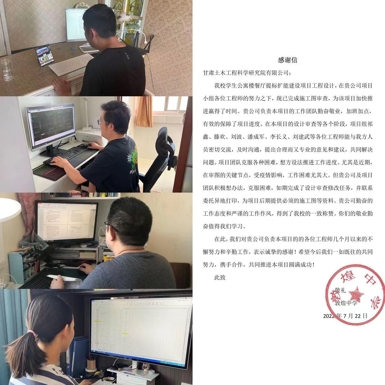 設(shè)計(jì)一所堅(jiān)決貫徹土木工程院黨委要求,第一時(shí)間部署疫情防控工作。在部門(mén)職工居家辦公期間,積極與軟件公司溝通協(xié)調(diào),為所有設(shè)計(jì)軟件增加了在線使用版,并利用釘釘、微信進(jìn)行線上溝通,疫情期間完成了2022年華亭市安口鎮(zhèn)老舊小區(qū)住宅樓棚戶區(qū)改造項(xiàng)目施工圖審查、甘肅武威工業(yè)園區(qū)天馬資源開(kāi)發(fā)有限公司鋼結(jié)構(gòu)標(biāo)準(zhǔn)化廠房建設(shè)項(xiàng)目、敦煌中學(xué)學(xué)生公寓樓餐廳提標(biāo)擴(kuò)能建設(shè)等項(xiàng)目,得到建設(shè)單位的一致好評(píng)和致信感謝,極大提升了部門(mén)員工技術(shù)創(chuàng)新、全方位服務(wù)的工作熱情。