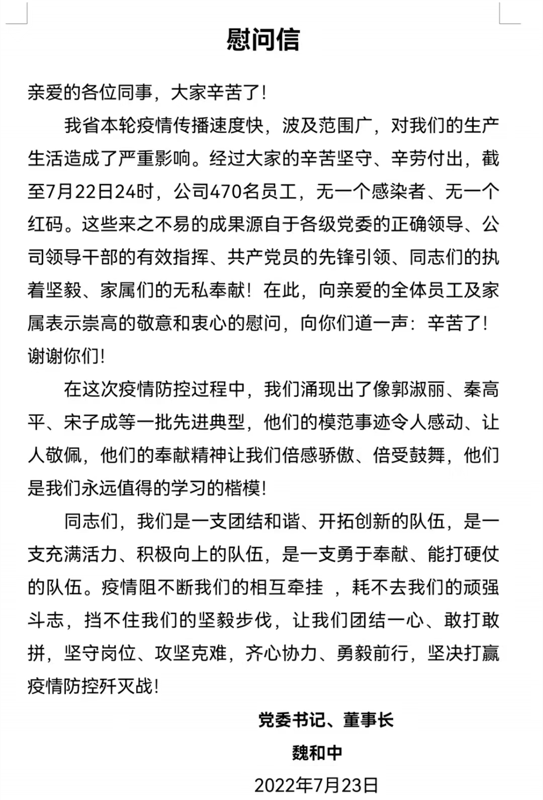 近日,甘肅省建設監(jiān)理有限責任公司黨委書記、董事長魏和中向全體職工發(fā)出慰問信,對在疫情期間值守項目一線和抗戰(zhàn)疫情一線的黨員干部職工致以最誠摯的關心和感謝。同時,號召全體干部職工向疫情防控期間涌現(xiàn)出的一線先進典型個人和共產黨員先鋒者學習,團結一心、敢打敢拼,堅守崗位、攻堅克難,齊心協(xié)力、勇毅前行,堅決打贏疫情防控殲滅戰(zhàn)。