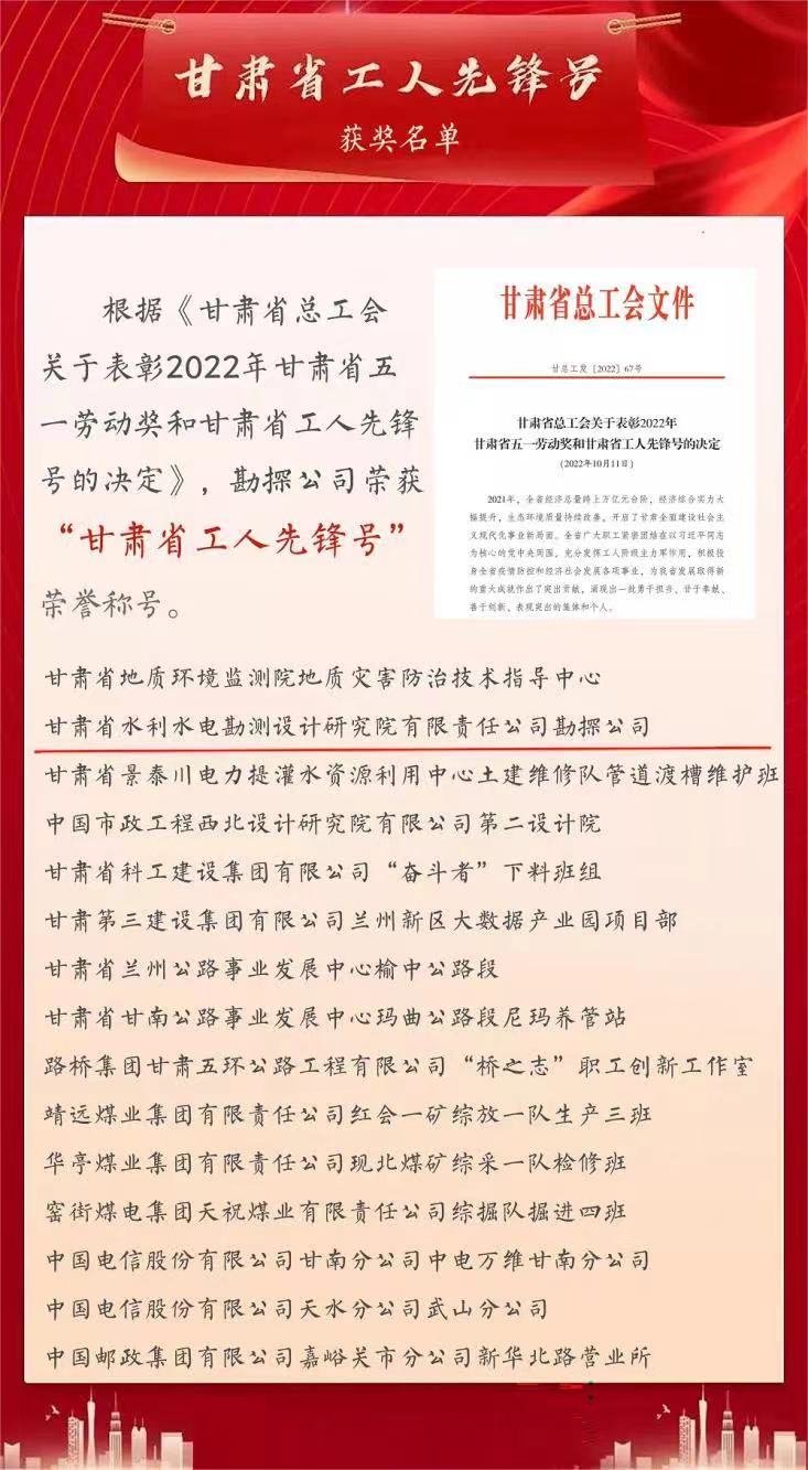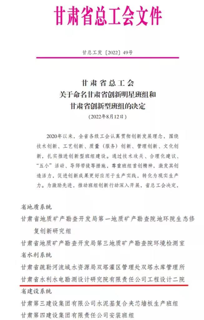 近日,甘肅省總工會發(fā)布2022年度“甘肅省工人先鋒號”和“甘肅省創(chuàng)新型班組”名單,甘肅省水電設計院的勘探公司榮獲2022年度“甘肅省工人先鋒號”稱號,工程設計二院榮獲“甘肅省創(chuàng)新型班組”榮譽稱號。