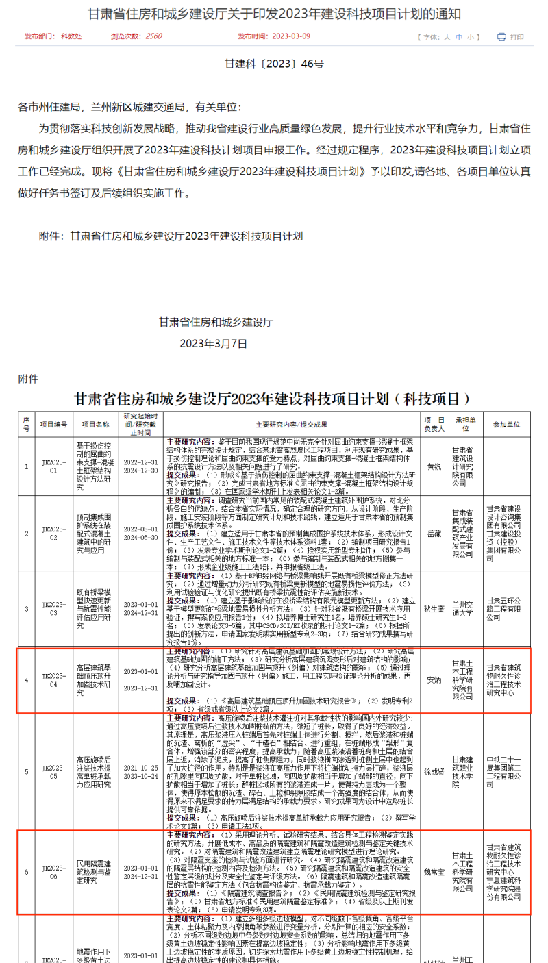 近日,從《甘肅省住房和城鄉(xiāng)建設(shè)廳關(guān)于印發(fā)2023年建設(shè)科技項(xiàng)目計(jì)劃的通知》(甘建科〔2023〕46號(hào))獲悉,由土木工程院組織申報(bào)的兩項(xiàng)科技攻關(guān)項(xiàng)目《高層建筑基礎(chǔ)預(yù)壓頂升加固技術(shù)研究》(立項(xiàng)編號(hào)JK2023-03)、民用隔震建筑檢測(cè)與鑒定研究(立項(xiàng)編號(hào)JK2023-06)和兩項(xiàng)軟課題《2022-2023年度甘肅省民用建筑能耗統(tǒng)計(jì)數(shù)據(jù)分析與研究》(立項(xiàng)編號(hào)JK2023-45)、《2022年度甘肅省建筑能耗監(jiān)測(cè)平臺(tái)的能耗數(shù)據(jù)分析與研究》(立項(xiàng)編號(hào)JK2023-46)成功獲批立項(xiàng)。