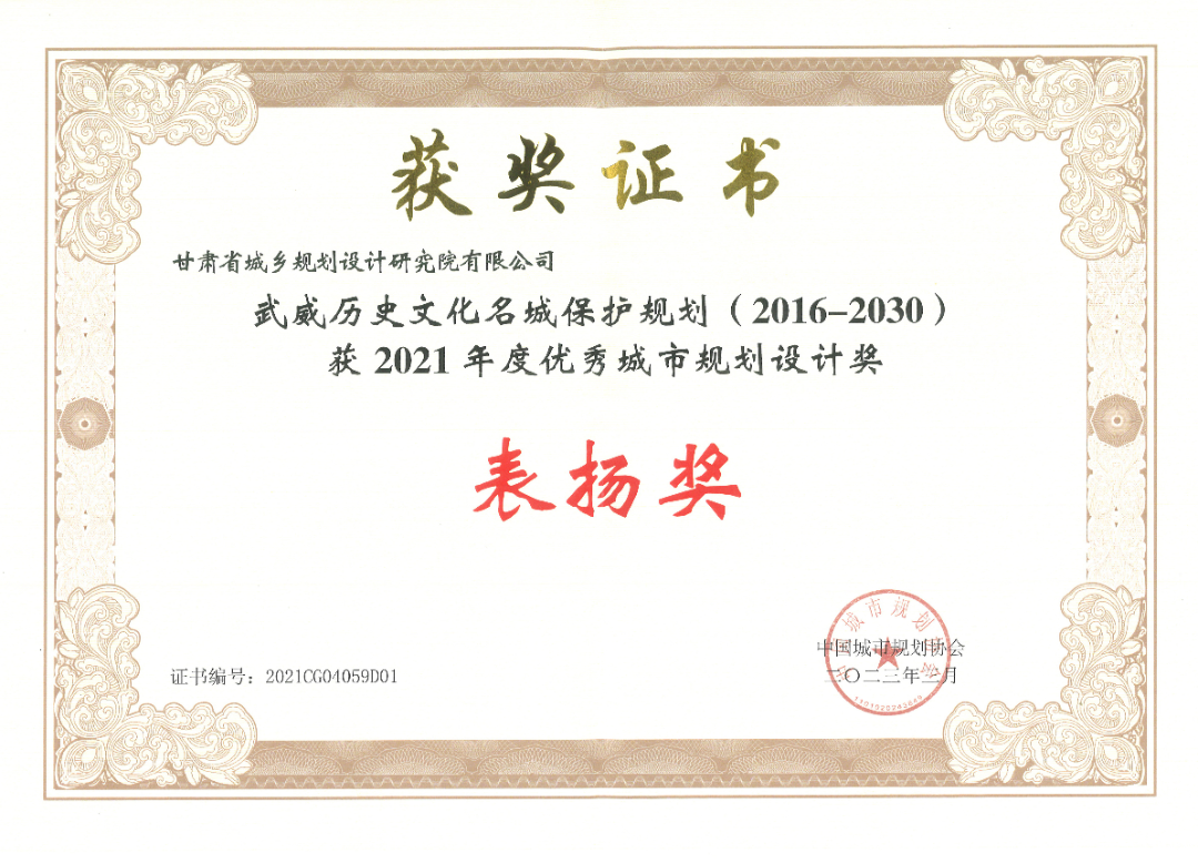 近期,由省規(guī)劃設(shè)計(jì)院編制的《武威歷史文化名城保護(hù)規(guī)劃(2016-2030)》項(xiàng)目榮獲全國(guó)“2021年度優(yōu)秀城市規(guī)劃設(shè)計(jì)獎(jiǎng)”表?yè)P(yáng)獎(jiǎng),為我省歷史文化名城保護(hù)專業(yè)類唯一獲獎(jiǎng)項(xiàng)目。