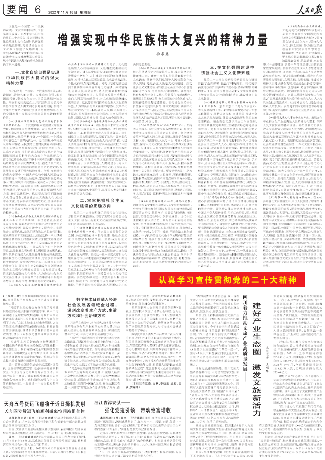 文化是一個國家、一個民族的靈魂。文化興則國運興,文化強則民族強。習(xí)近平總書記所作的黨的二十大報告,深刻把握文化建設(shè)規(guī)律和文化在新時代新征程中的地位作用,對建設(shè)社會主義文化強國作出了戰(zhàn)略部署,為我們不斷推進文化自信自強、鑄就社會主義文化新輝煌、增強實現(xiàn)中華民族偉大復(fù)興的精神力量提供了根本遵循。