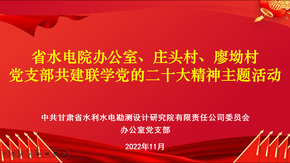 為持續(xù)促進(jìn)黨的二十大精神學(xué)習(xí)貫徹走深走實,使黨的二十大精神進(jìn)村入戶、深入人心,11月22日,甘肅省水利水電勘測設(shè)計研究院有限責(zé)任公司辦公室黨支部與幫扶村西峰區(qū)莊頭村黨支部、廖坳村黨支部開展共建聯(lián)學(xué)黨的二十大精神主題活動。